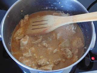 Pour everything in a pot and add the meat. Let it simmer in until the meat is well cooked. This will take about 30 minutes.